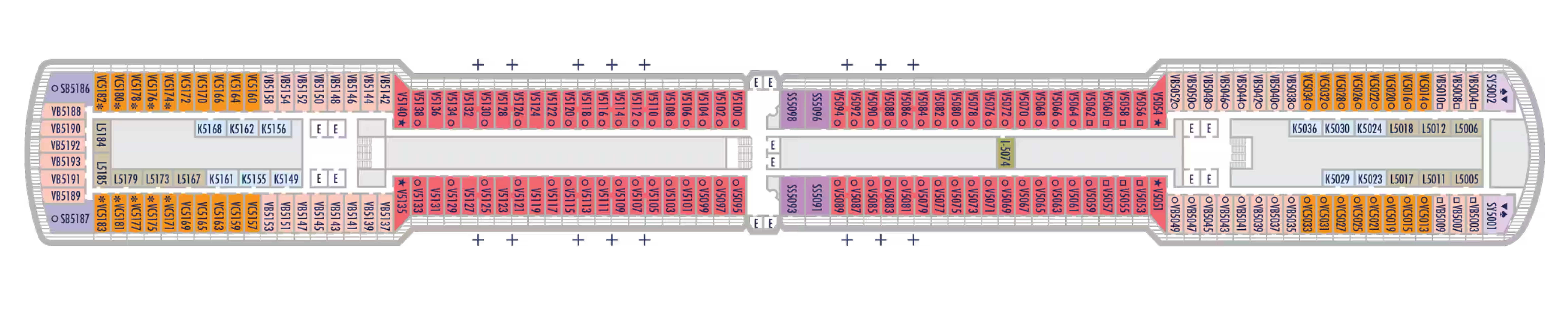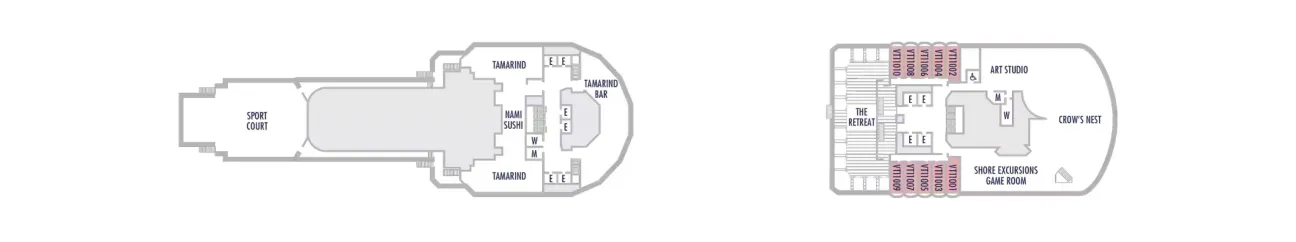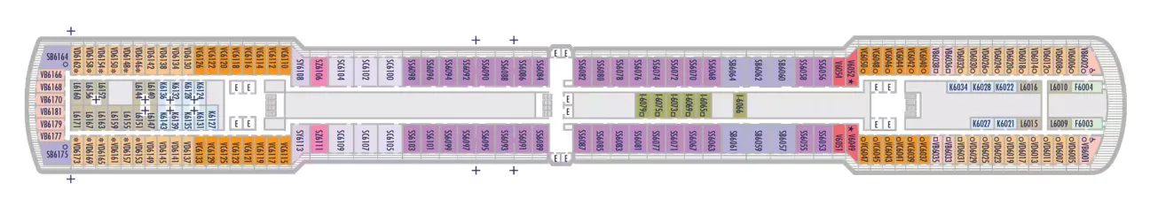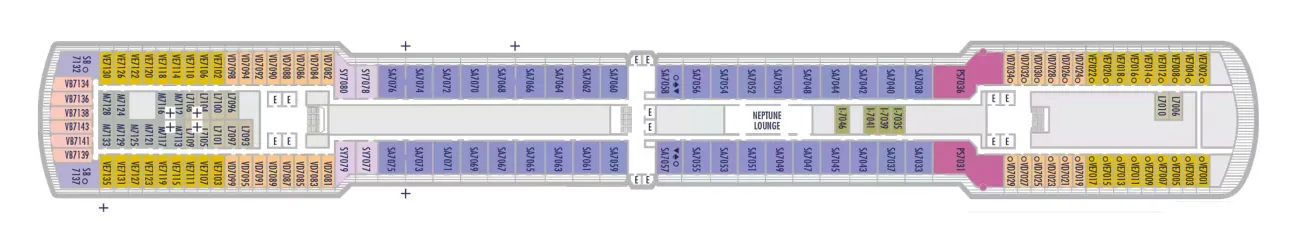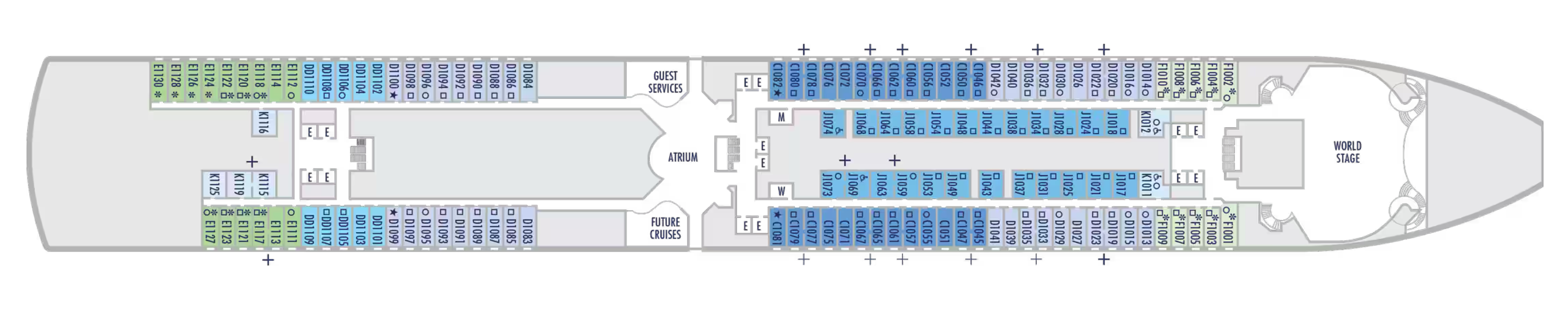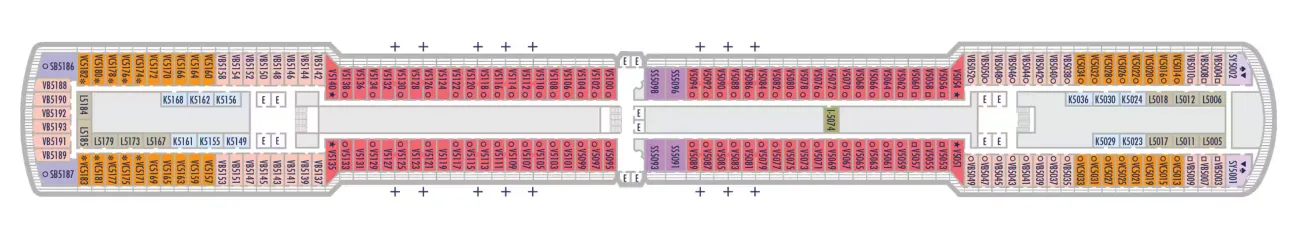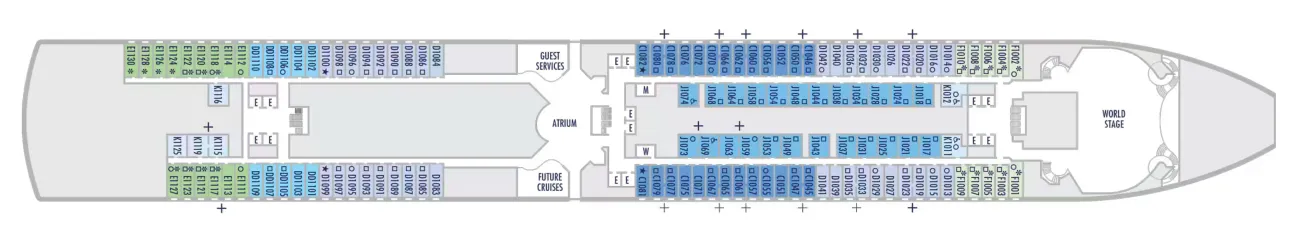 - Less ocean movement and proximity to Lower Promenade dining and entertainment.